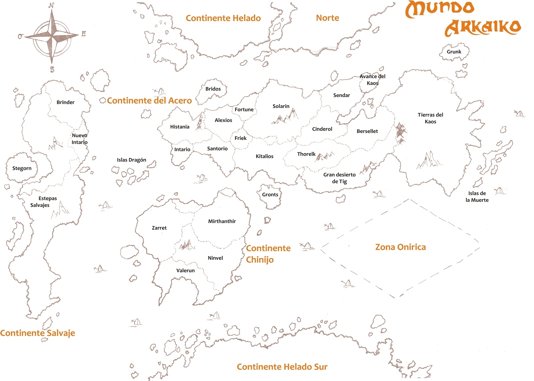 Solo los más concienzudos estudiosos o sabios conocen las inmensas y magníficas extensiones del mundo Arkaiko, está compuesto por cinco continentes y varios grupos de islas repartidas por todo el mundo, conectados entre sí por vastos océanos. A continuación intentaremos ofrecer una pequeña referencia a estos continentes, y extensiones de tierra.
