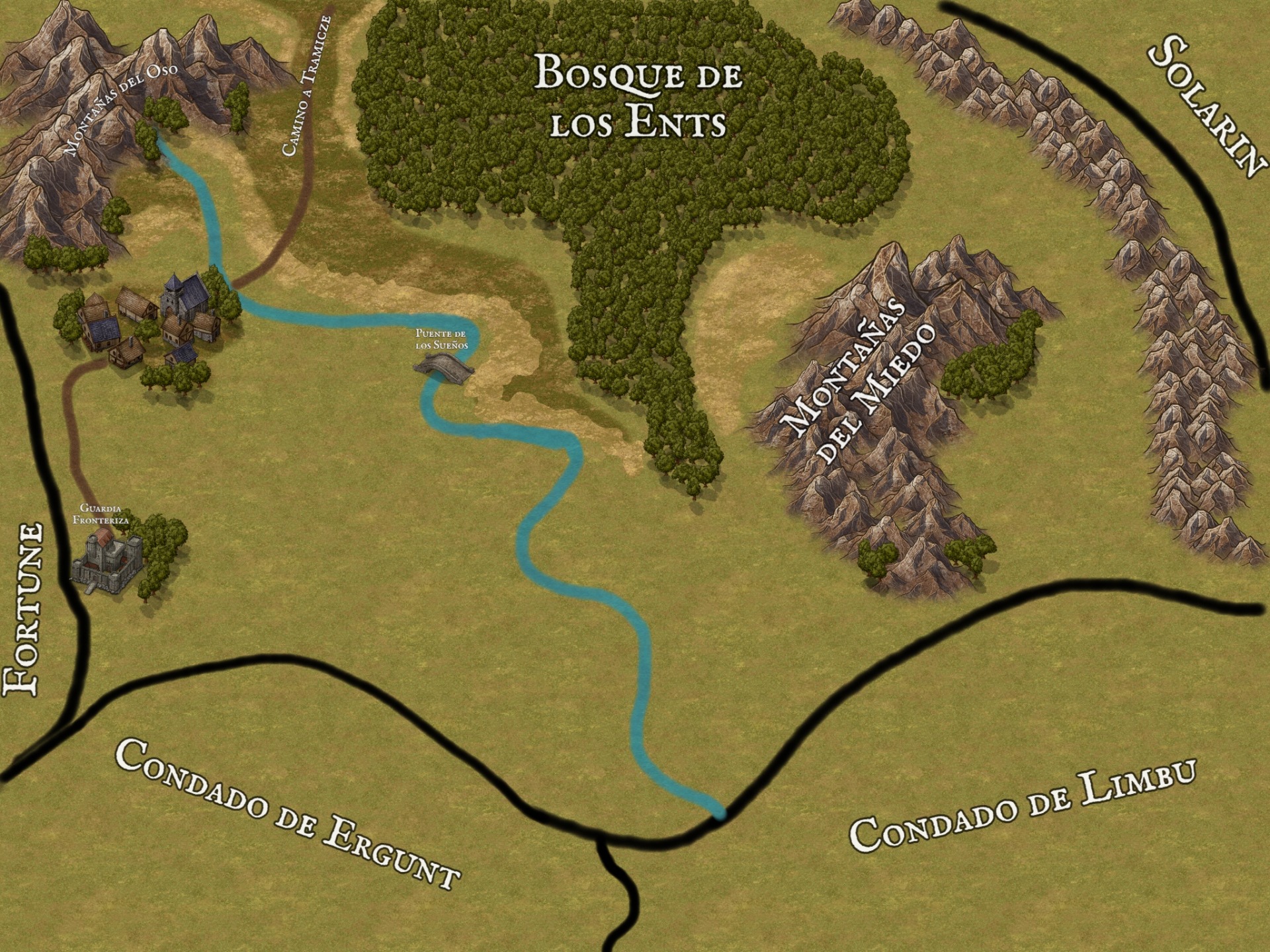 Solaerun. Se extiende más allá de las puertas del oeste de Solarin capital, famoso por albergar el místico Bosque de los Ents que linda; al oeste con el visitado y misterioso Puente de los Sueños, del que se dice que cada viajero tiene su historia que contar al cruzarlo, y al norte con la terrorífica Montaña del Miedo, un lugar evitado por los propios habitantes del reino, e incluso por los magníficos Caballeros de Solarin.