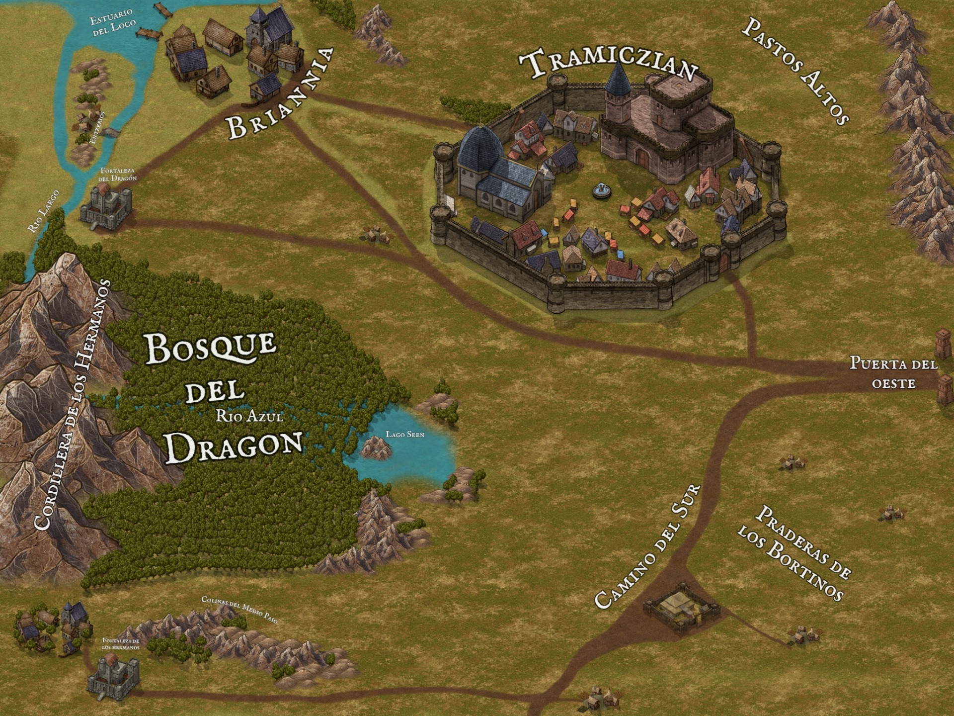 Tramicze. Localizado al norte de Solaerun, reúne varios asentamientos, y lugares de interés como; La urbe de Tramiczian que ha se ha convertido con el paso del tiempo en la capital del ducado, el Lago Senn que se alimenta del Río Azul, el que a su vez atraviesa el antiguo Bosque del Dragón, el que se se supone, hace siglos, era gobernado por un poderoso dragón, aunque nadie ya lo cree. Después de atravesar el bosque nos encontramos al sur la Fortaleza de los Hermanos, y al norte la Fortaleza del Dragón, ambas sirven como refuerzo fronterizo del infame reino de Fortune. La ciudad de Briannia, famosa por sus astilleros y artesanos navales. Y por último Entrerios, el pueblo que fabrica la mejor brea para navíos de todo el reino, que está bajo la custodia de Briannia.