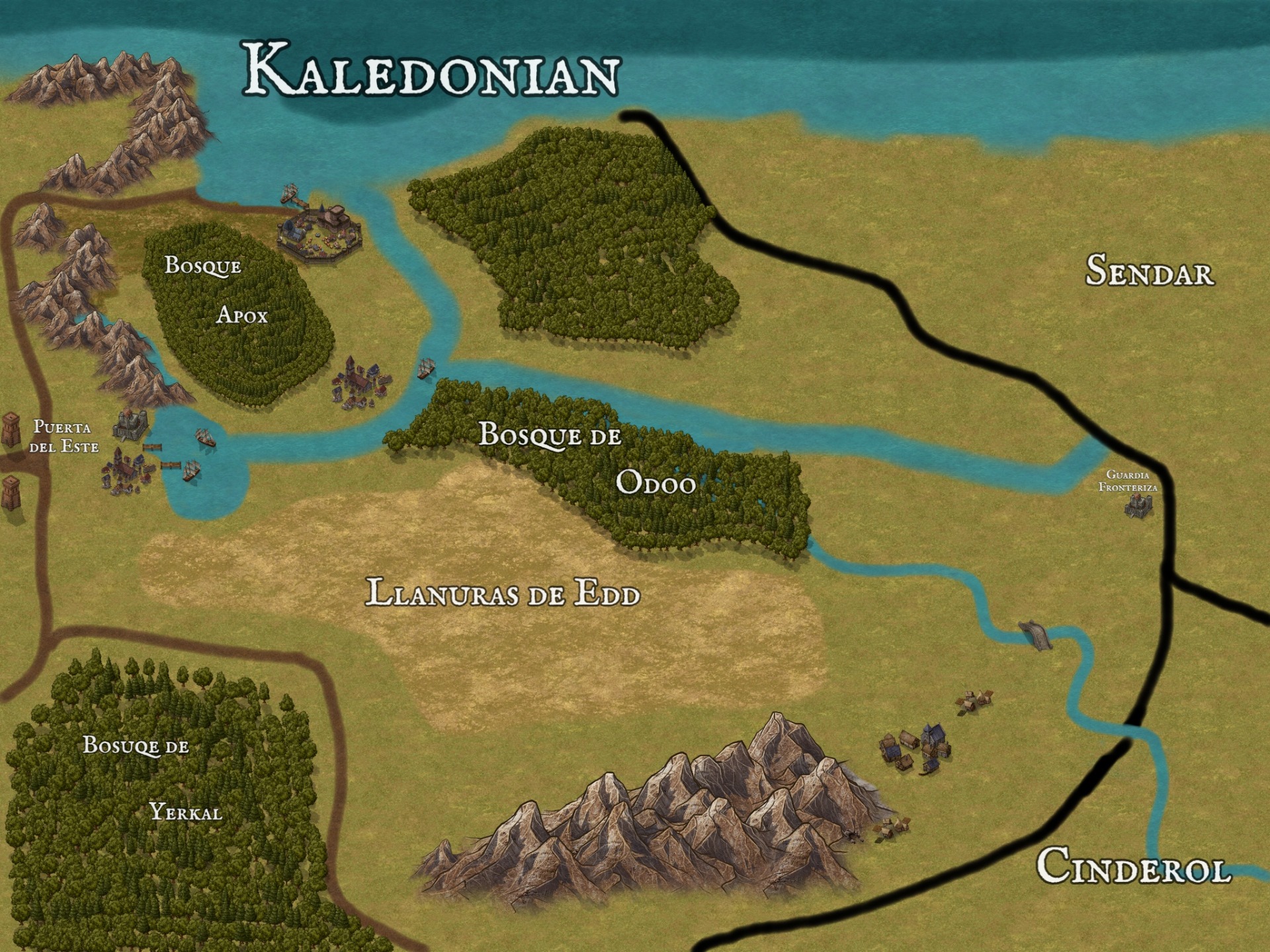 Kaledonian. El ducado que tendríamos que cruzar para llegar a las puertas del este de Solarin capital, teniendo cuidado de atravesar las extensas y peligrosas Llanuras de Edd. Podemos encontrar un gran bosque dividido por un sistema montañoso donde nacen dos ríos, en dirección norte atravesando el Bosque Apok, y hacia el sur el Bosque de Odoo.