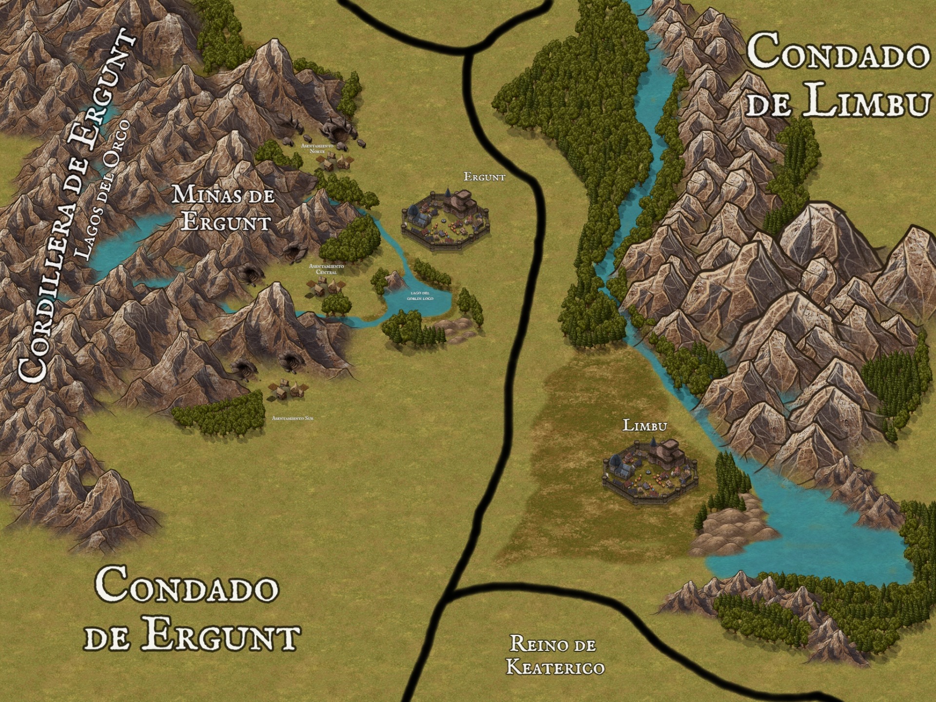 Ergunt y Limbu. Los dos ducados mas alejados de la civilización y también los mas recientes en tener un duque. Son territorios casi vírgenes con bosques, montañas, llanuras, minas, etc. Apenas un asentamiento para la protección de los habitantes o viajeros que pasen por el condado, son una oportunidad de comercio, expansión y exploración.